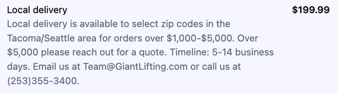 We do a route system for orders over $1,000 with multiple customers with each delivery route to make receiving your equipment less expensive ($149.99-$199.99). For orders over $5,000 please reach out for a quote. If you have questions, please reach out to team@giantlifting.com